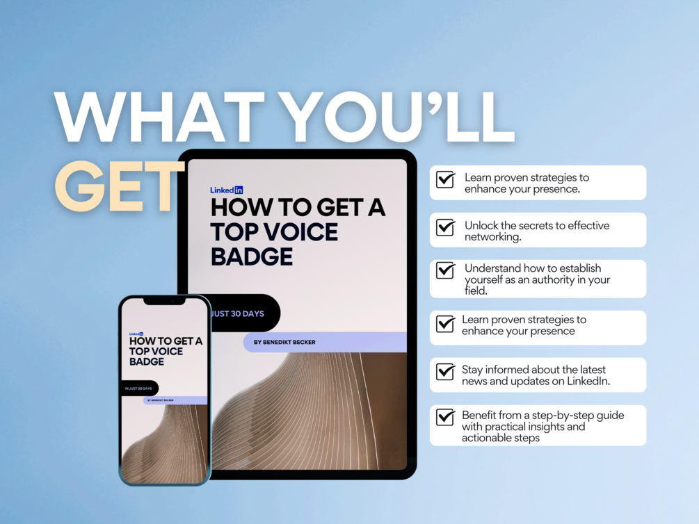 Profile Perfection: Learn how to prepare and optimize your profile for maximum impact and visibility. Understanding the Badge: A deep dive into what the Top Voice badge is and why it matters. Content Mastery: Strategies for creating posts that resonate with your audience and increase engagement. Diverse Content Types: Explore various content formats to keep your feed fresh and engaging. Engagement Secrets: Step-by-step instructions on how to effectively participate in conversations and build meaningful connections. Success Checklist: A comprehensive checklist to track your progress and ensure you're on the right path.
