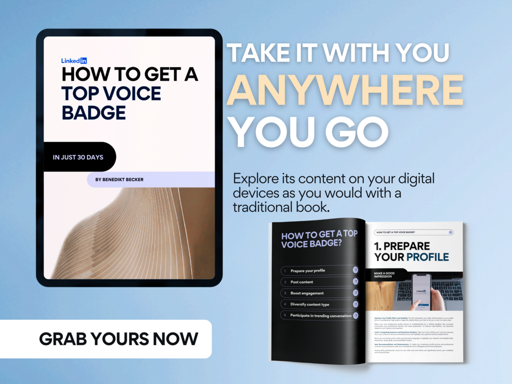 Profile Perfection: Learn how to prepare and optimize your profile for maximum impact and visibility. Understanding the Badge: A deep dive into what the Top Voice badge is and why it matters. Content Mastery: Strategies for creating posts that resonate with your audience and increase engagement. Diverse Content Types: Explore various content formats to keep your feed fresh and engaging. Engagement Secrets: Step-by-step instructions on how to effectively participate in conversations and build meaningful connections. Success Checklist: A comprehensive checklist to track your progress and ensure you're on the right path.